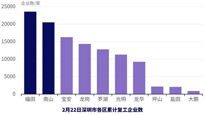 截至2月22日,全市累計復工企業已達11萬余家,其中,福田區、南山區已有超過2萬家企業復工,復工率在全國主要經濟城市中名列前茅。