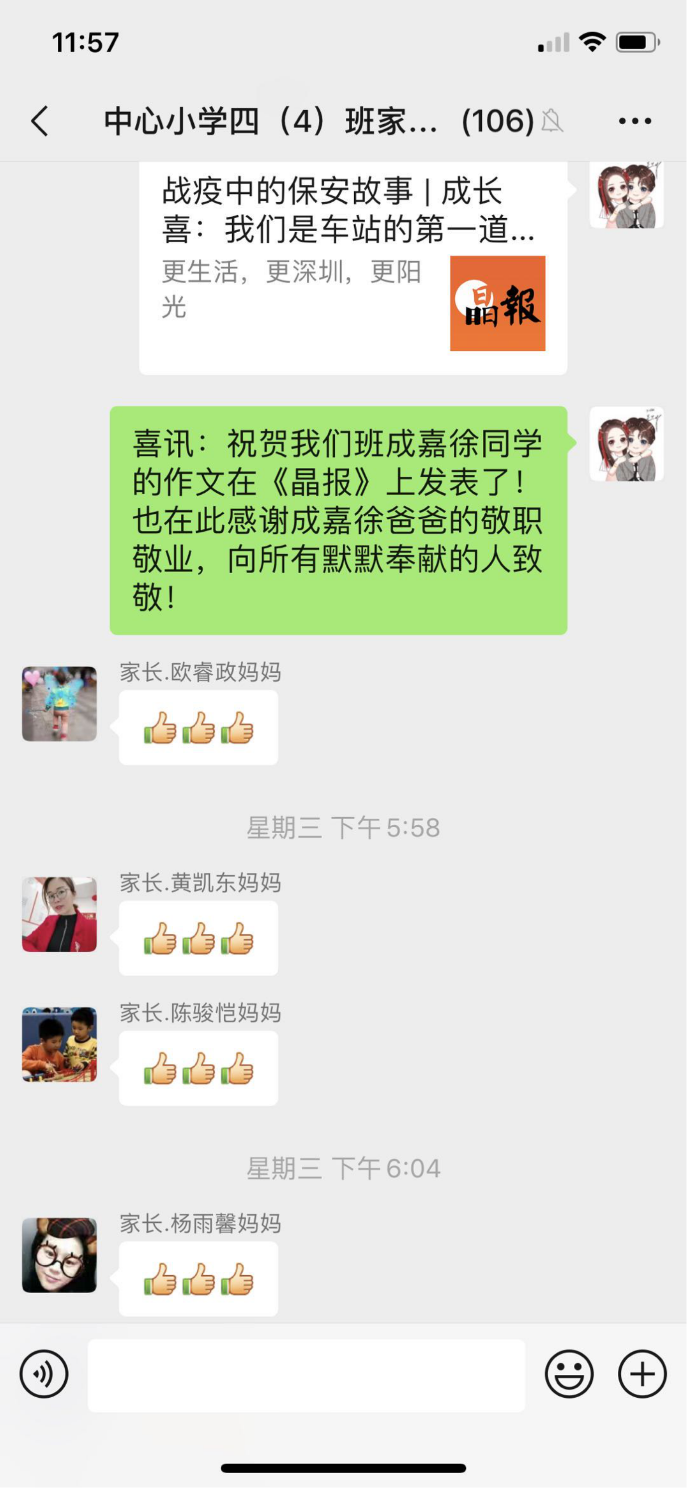 因為網(wǎng)課,班里的學(xué)生有了很多新體驗,比如嘗試自己做一頓飯,自制放大鏡,和父母一起運動鍛煉等。“有位學(xué)生寫了一篇講述他爸爸在抗疫一線忙碌工作的作文,發(fā)給我看讓我指導(dǎo),后來作文在《晶報》上登了出來,我又把作文發(fā)到班級群里分享,讓大家學(xué)習(xí)這位同學(xué),學(xué)習(xí)他爸爸這種舍小家顧大家的行為,很多家長看到了都為他們點贊。”