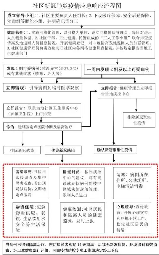 一、成立疫情應急領導小組,建立保障機制。社區及各有關單位成立主要負責人任領導小組組長的新冠肺炎疫情應急領導小組,下設醫療保障、安全后勤保障、消毒組等職能小組,并明確職責分工。