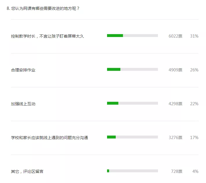 此外,22%的參與者認(rèn)為,網(wǎng)課缺乏教學(xué)氛圍,無法真正實(shí)現(xiàn)互動式在線課堂。有家長認(rèn)為,目前老師用群進(jìn)行講解,聊天消息過多,信息雜亂,老師無法及時答疑,建議老師通過小視頻等形式將熱點(diǎn)問題再進(jìn)行補(bǔ)充講解。
