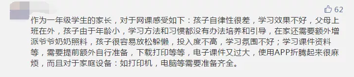 有些參與者則直接留言:由于孩子自律性差,建議低年級不上網(wǎng)課。