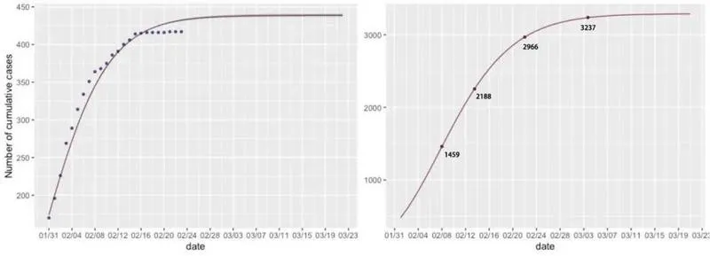 進一步地擬合深圳新冠肺炎的累計確診人數(shù),并對累計確診人數(shù)做出預(yù)測。可以看到,模型預(yù)測自2月28日起病例數(shù)不再增加,預(yù)測得到最終的累計確診人數(shù)收斂在422人左右。