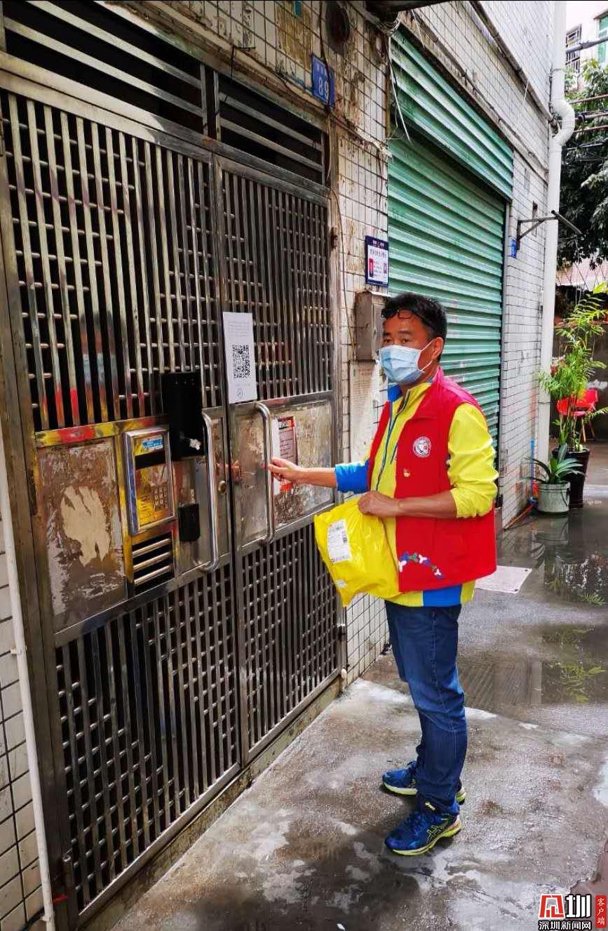 社區工作人員陳強上門為居家隔離住戶派送快遞