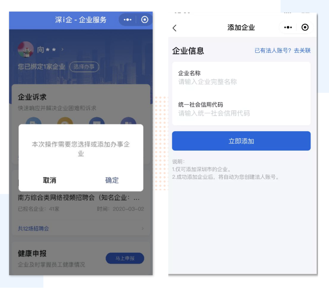 登錄后,進入“深i企-精準服務企業(yè)”平臺主頁面,點擊“選擇辦事”。法人或經(jīng)辦人通過輸入企業(yè)名稱和統(tǒng)一社會信用代碼添加辦事企業(yè),也可以通過已有法人賬號關(guān)聯(lián)企業(yè)。