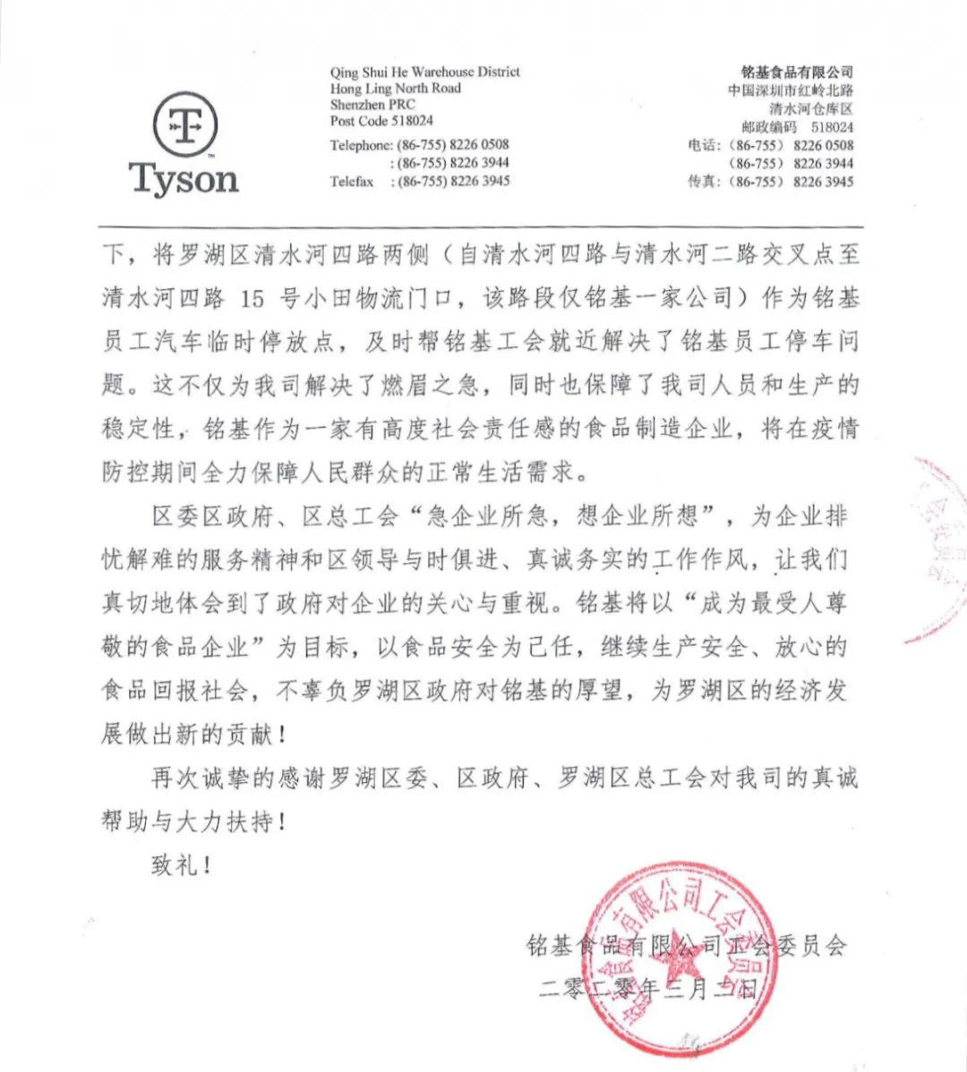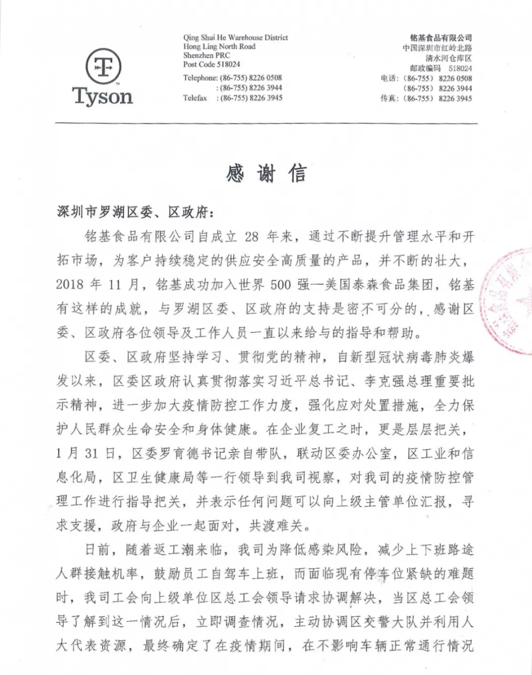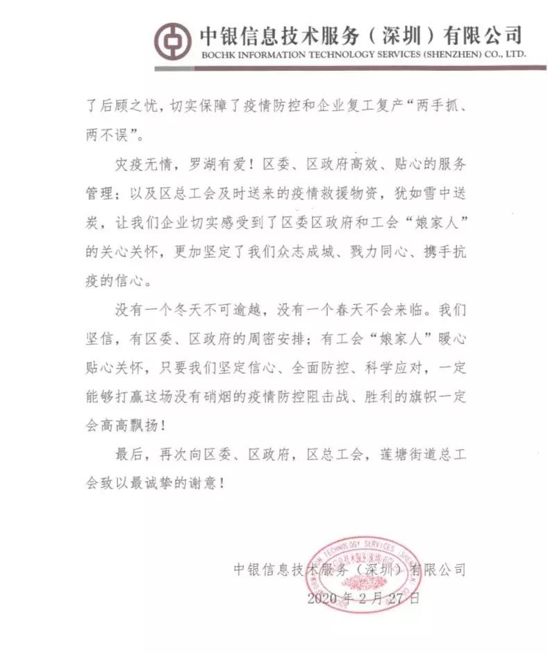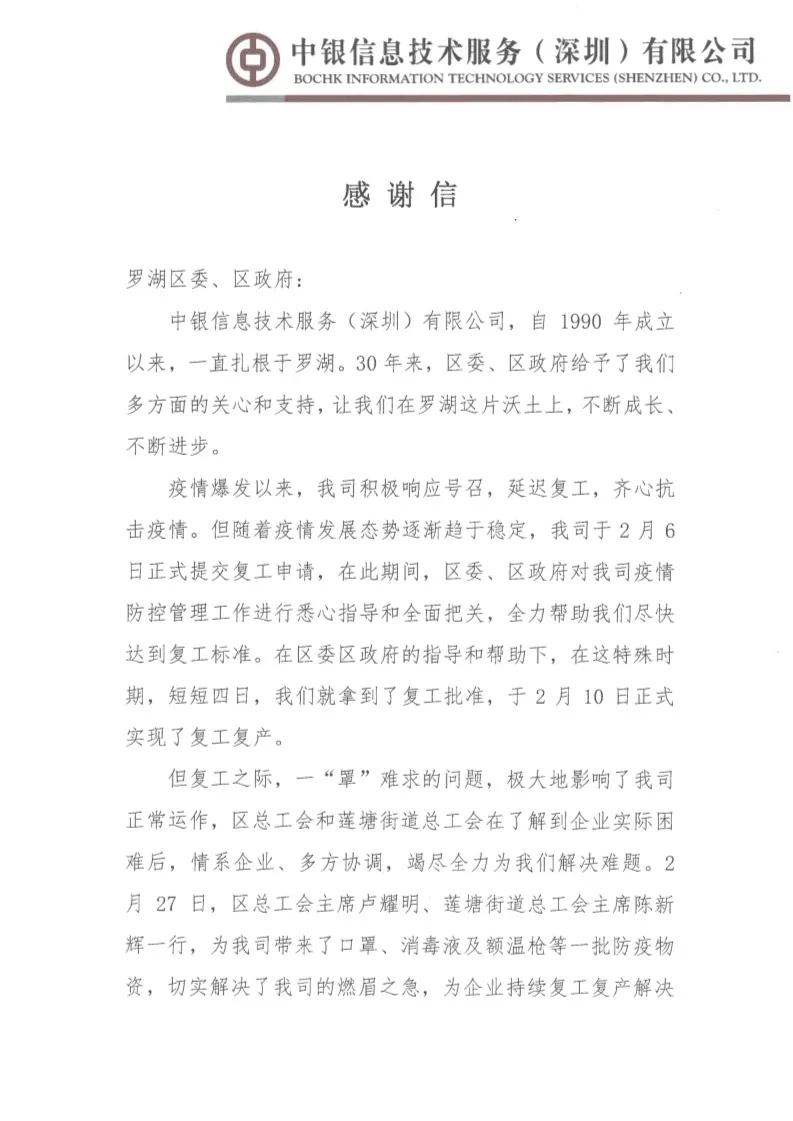 中銀信息技術服務(深圳)有限公司、銘基食品有限公司在復工復產后都遇到了一些困難,羅湖工會了解了他們的情況后,主動發揮工會作用,幫企業解決困難,協助他們順利復工復產。近日,兩封感謝信送到了羅湖區委、區政府,向羅湖羅湖區委、區政府以及羅湖各級工會為企業的付出表示感謝。