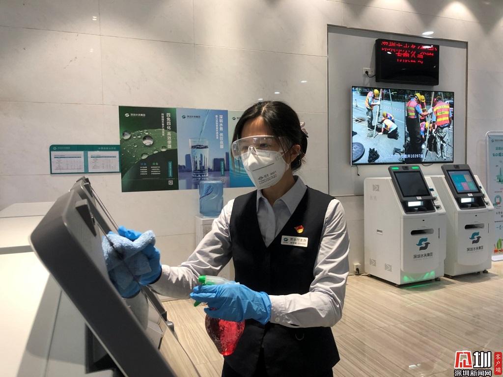 為客戶提供安全、優質的服務,是深水人的不懈追求。福田分公司福田營業廳楊麗娜,正對自動服務機進行消毒。