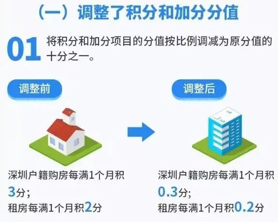 (1)深圳戶籍購房從每滿1個月積3分,調整為積0.3分;租房從每滿1個月積2分,調整為0.2分。