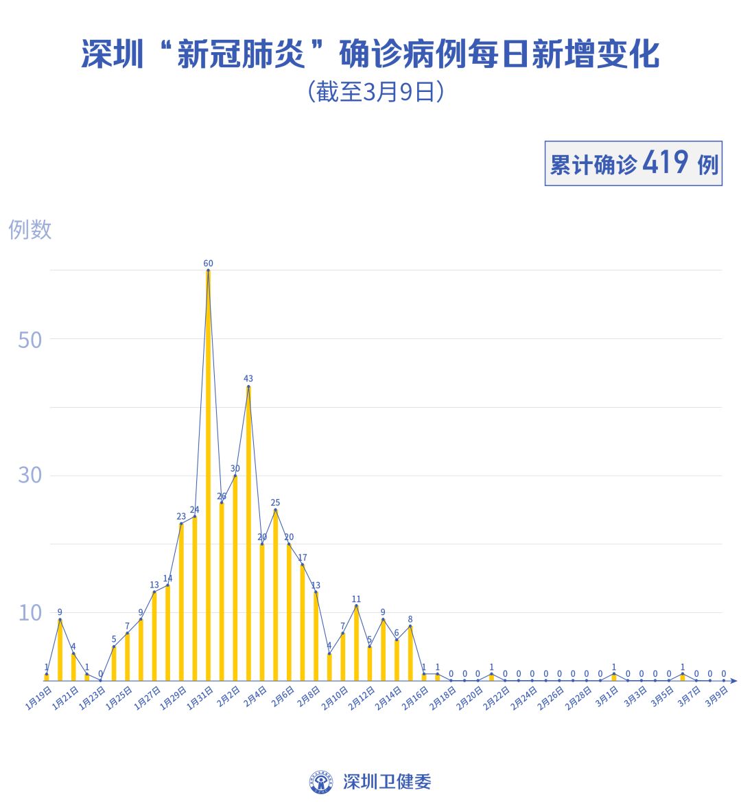 截至3月9日24時,深圳累計報告“新冠肺炎”確診病例419例。3月9日當天全市無新增確診病例,當天出院病例8例(從2月26日起不再公布出院個案)。