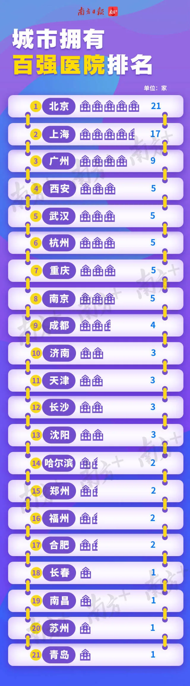 南方經濟智庫梳理后發現,全國排名前100的醫院中,47所被北京、上海、廣州囊括。前10個城市包攬幾乎總數80%的百強醫院。