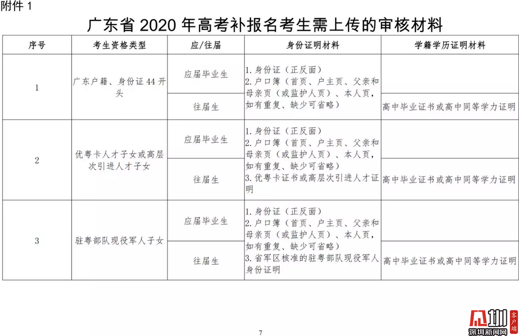 見圳客戶端·深圳新聞網2020年3月19日訊(見圳客戶端、深圳新聞網記者 金洪竹)3月18日,記者從廣東省招生委員會辦公室獲悉,為滿足退伍軍人、運動訓練及武術與民族傳統體育考生、高職院校自主招生考生等符合我省高考條件,因各種原因尚未參加高考報名人員的需求,經研究決定安排一次高考補報名,補報名時間為3月23-26日。同時,為確保考生和考試工作人員的生命安全和身體健康,減少聚集,本次高考補報名采取先線上辦理、后補驗材料的方式進行。