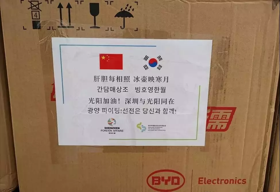 在韓國(guó)光陽(yáng)寄來(lái)深圳的物資箱上,寫著“心相通,民相親,天涯咫尺間”。而在深圳此次寄出的物資箱上,也深情引用了韓國(guó)詩(shī)人許筠的一句詩(shī):“肝膽每相照,冰壺映寒月。”