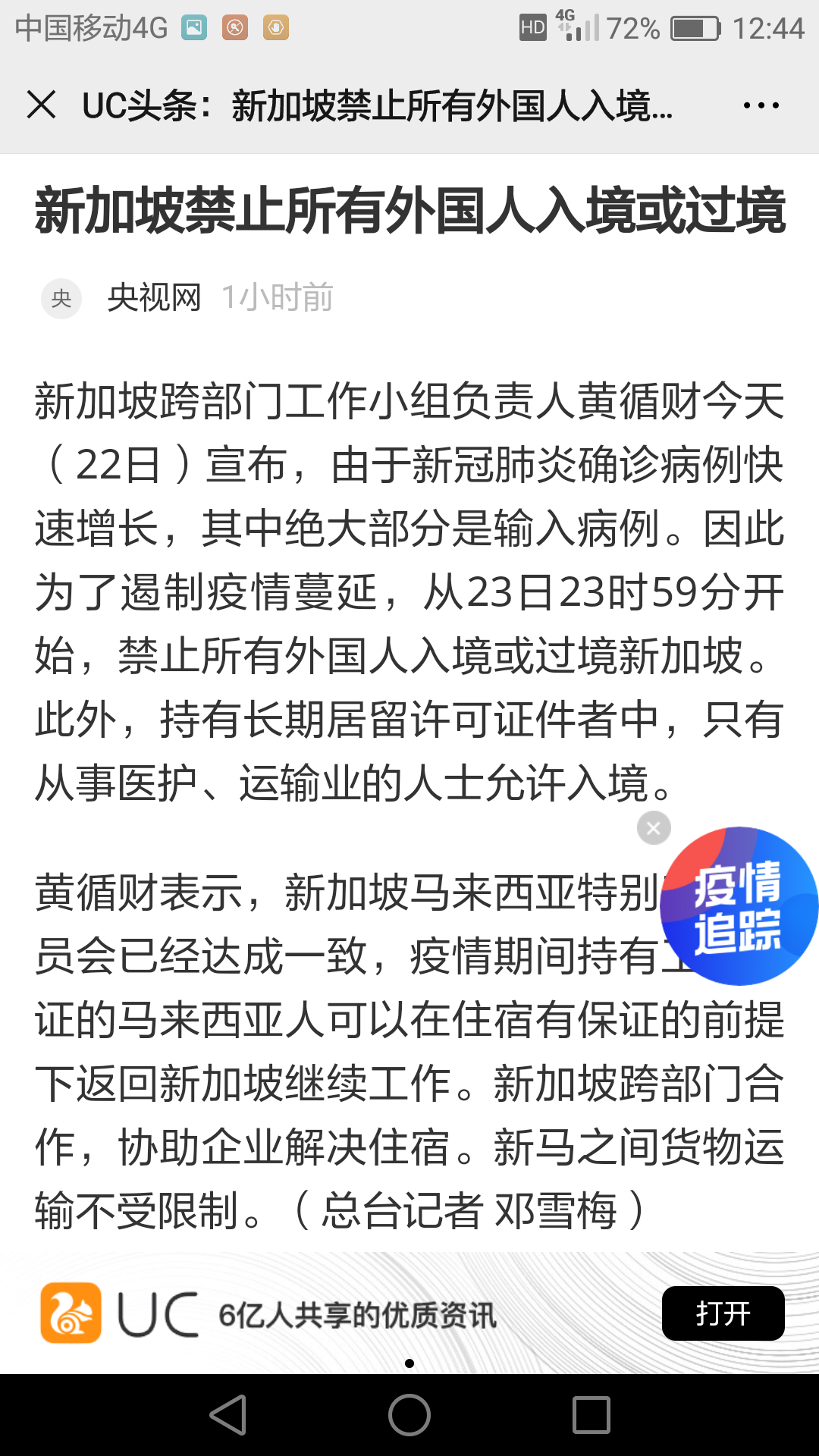 今日早些時候,據央視網報道,新加坡跨部門工作小組負責人宣布,為遏制疫情蔓延,從23日23時59分開始,禁止所有外國人入境或過境新加坡。同時,持有長期居留許可證件者中,也只有從事醫護、運輸業的人士允許入境。(記者蔡良煥)