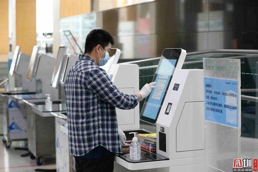 自助借閱機前,一位讀者正在操作機器。
