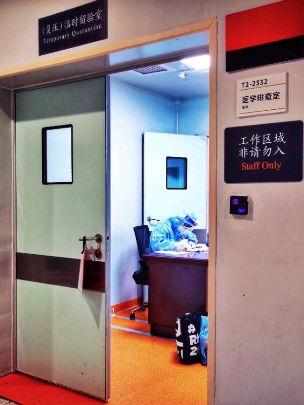 因為我有輕微鼻炎、中耳炎,主動申報后被單獨帶走詢問流行病學史,并做鼻、咽拭子檢測。檢測的時候跟醫(yī)生聊天,他們說他們有好幾班醫(yī)生要24小時輪守。棉球棒取出時沾著點血,醫(yī)生說可能是黏膜太干燥了,不用擔心,我說應該是,我大概15個小時沒喝水了。但我想防護服下的他大概也很久不能喝水。
