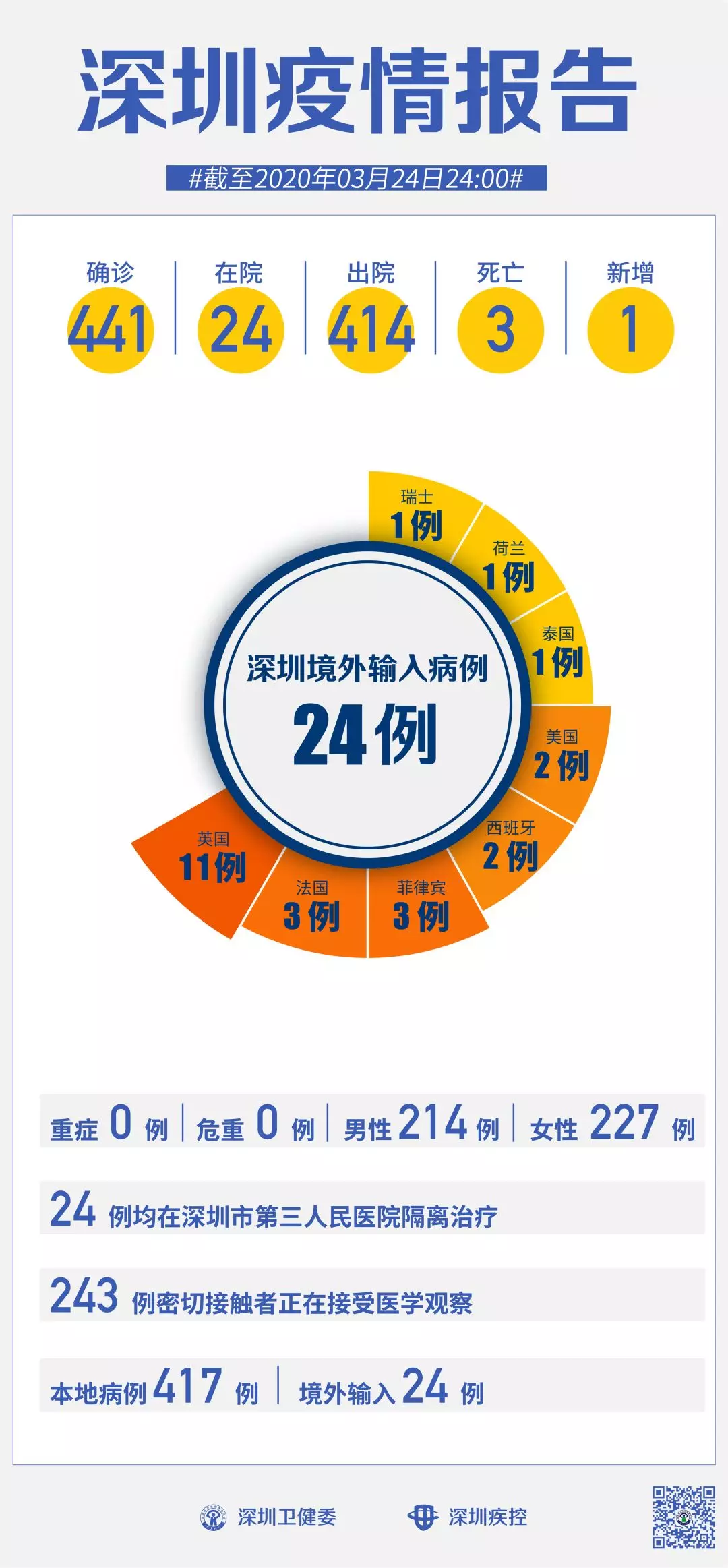 3月24日,深圳確診1例境外輸入“新冠肺炎”新病例,累計達24例。 病例24 男,31歲,巴西籍,在深圳工作,由英國返回。3月21日從英國倫敦乘坐SQ305航班飛往新加坡,22日從新加坡乘坐CZ3040航班飛往中國廣州,當晚經廣州白云機場入境,入境體溫36.6℃。23日凌晨由專車送往深圳集中隔離觀察,24日新冠病毒核酸初篩陽性,當天深圳市疾控中心復核亦為陽性。 目前患者已被轉到深圳市第三人民醫院隔離治療。經初步判定,在中國內地有32名密切接觸者,已集中隔離。 截至3月24日24時,深圳累計報告“新冠肺炎”病例441例。3月24日當天新增1例。 累計報告確診病例中,男性214例、女性227例。 目前,死亡3例,累計出院414例。 24例確診病例均在深圳市第三人民醫院隔離治療。 243名密切接觸者正在接受醫學觀察。 資料來源:深圳市疾控中心、深圳市衛健委、廣東省衛健委