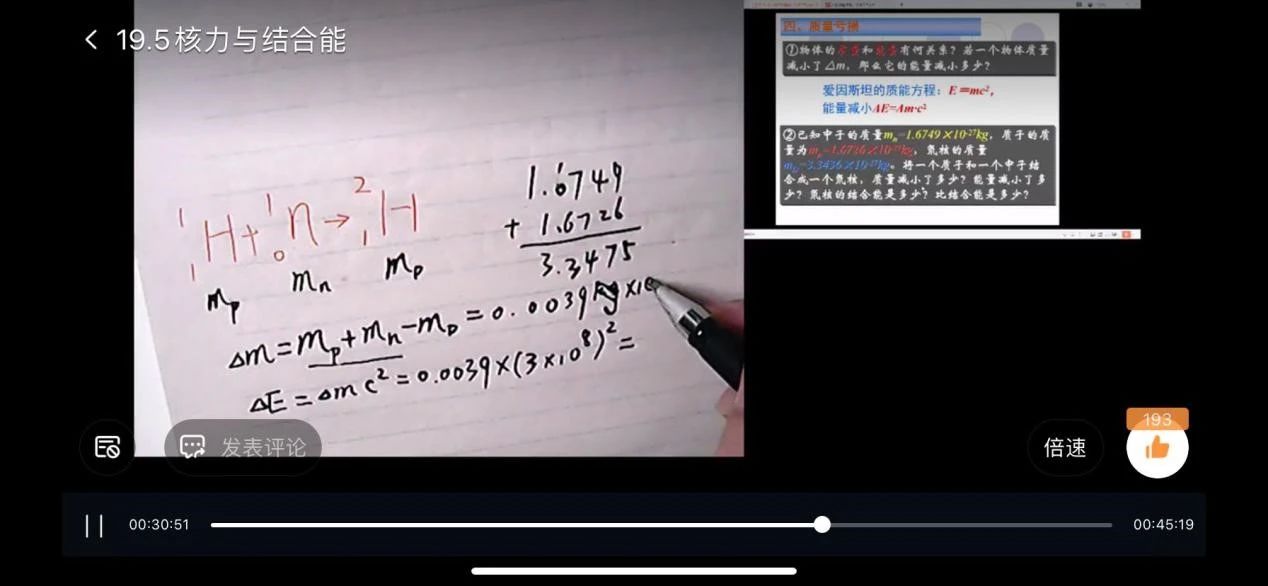 物理科何揚峰老師在執教《核力與結合能》一課時靈活運用手寫板、電腦和手機等多種工具,讓學生能夠同時看到PPT和教師板書畫面,完美地還原了在校學習情境。