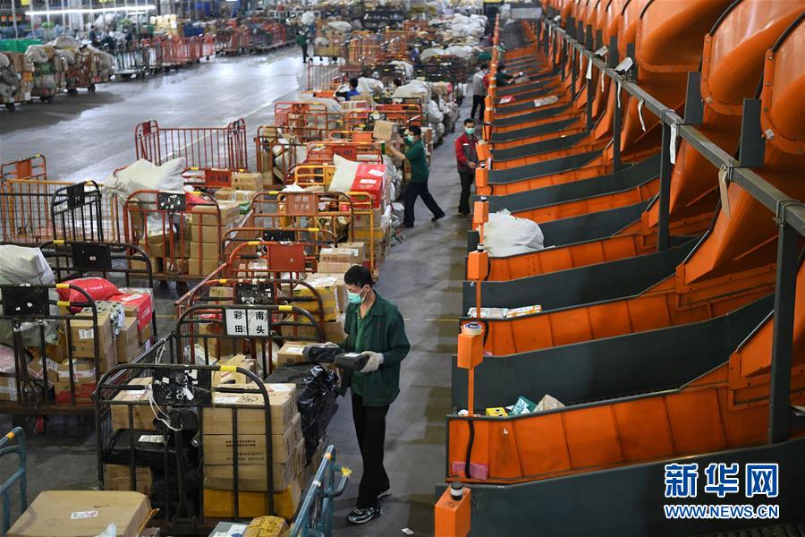 4月1日,在深圳郵件處理中心,工作人員在分揀郵件。據深圳市郵政管理局介紹,春節以來,深圳郵政快遞業累計向湖北運送各類醫療、防疫物資超2萬批次,累計為深圳市民配送防疫物資和生活必需品超過2.5億件,為防疫物資和群眾基本生活必需品送達提供了有力保障。新華社記者 梁旭 攝