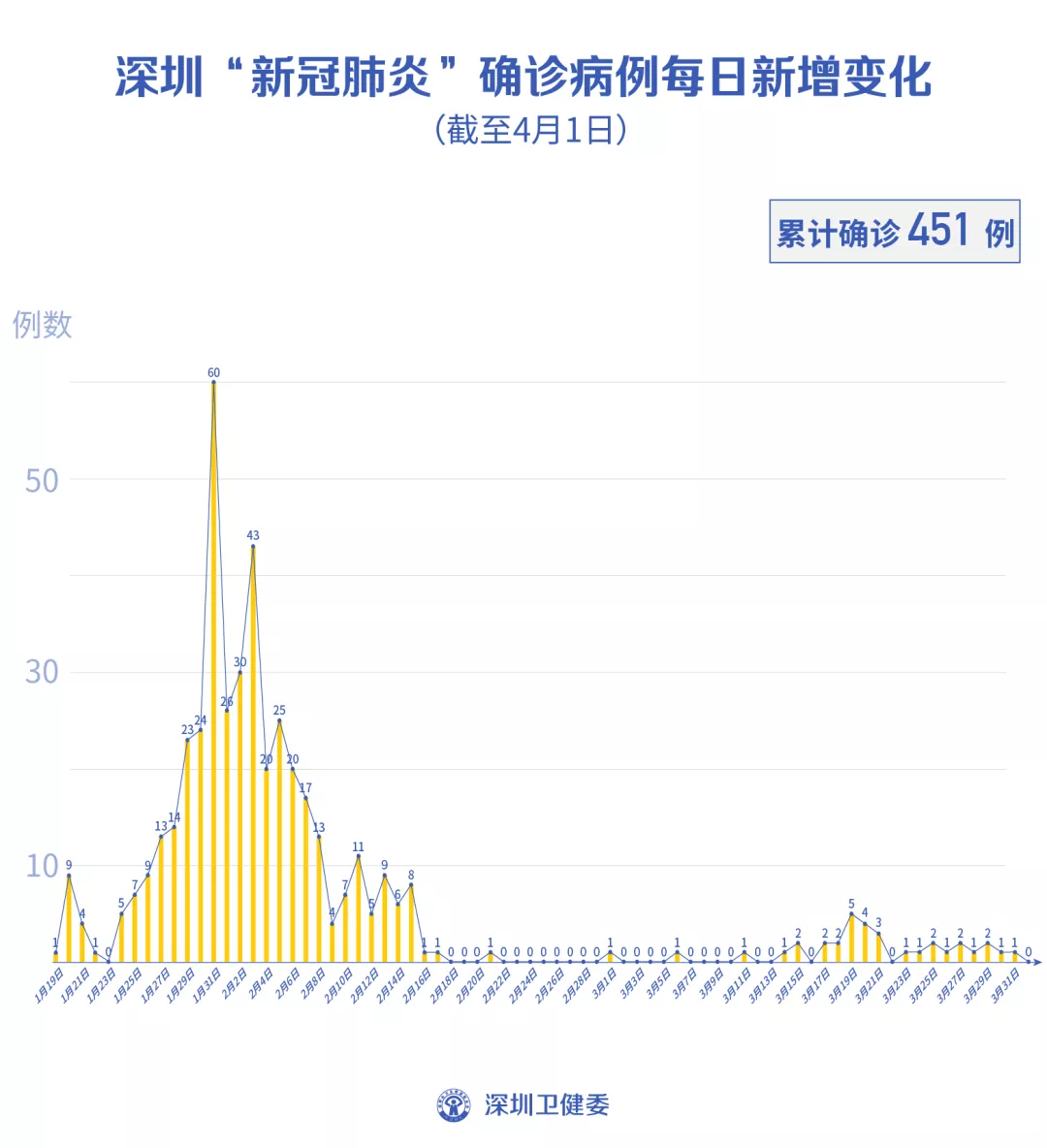 截至4月1日24時,深圳累計報告新冠肺炎病例451例。4月1日當天新增無癥狀感染者2例,出院2例。