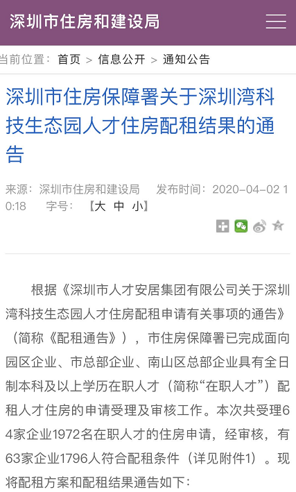 深圳特區報2020年4月2日訊 讀特記者4月2日從深圳市住房保障署獲悉,該署已完成面向園區企業、市總部企業、南山區總部企業具有全日制本科及以上學歷在職人才(簡稱“在職人才”)配租人才住房的申請受理及審核工作。本次共受理64家企業1972名在職人才的住房申請,經審核,有63家企業1796人符合配租條件。相關信息可登錄深圳市住房和建設局網站查看。