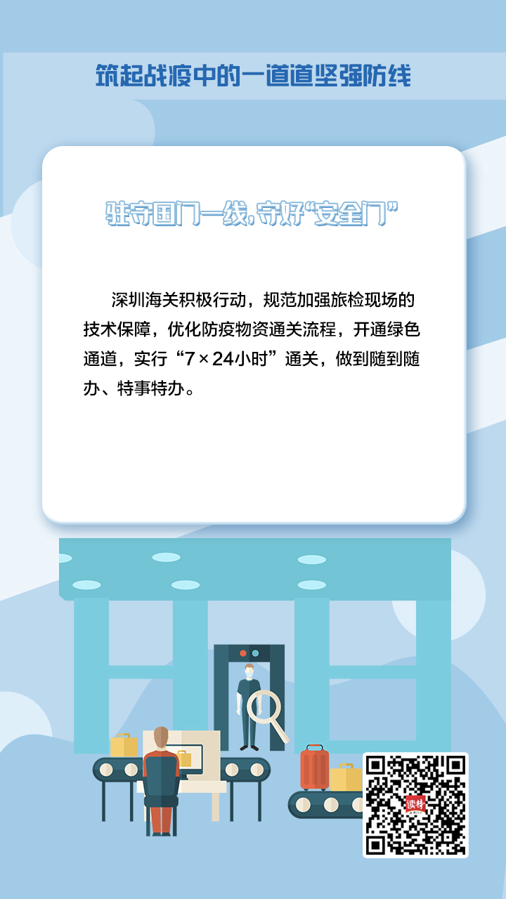 深圳在深圳灣口岸、深圳機場口岸設立24小時現場指揮部,海關、邊檢、口岸、衛生健康、公安、民航、航空等部門全部奮戰在防疫一線,通過入境健康申報、登臨檢疫、體溫監測、流行病學調查等舉措,筑牢口岸檢疫防線。