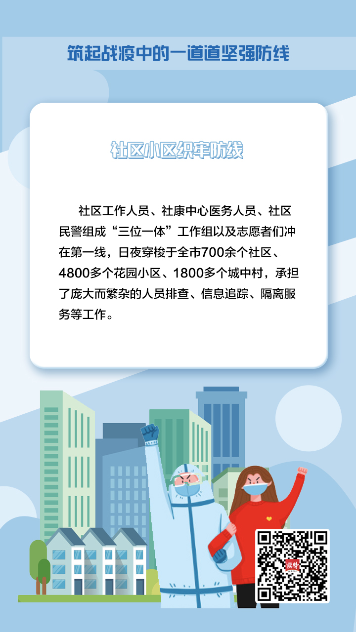 社區小區是“外防輸入、內防擴散”的有效防線,在這個關鍵戰場上,由社區工作人員、社康中心醫務人員、社區民警組成的“三位一體”工作組以及志愿者們沖在第一線,日夜穿梭于全市700余個社區、4800多個花園小區、1800多個城中村,承擔了龐大而繁雜的人員排查、信息追蹤、隔離服務等工作。