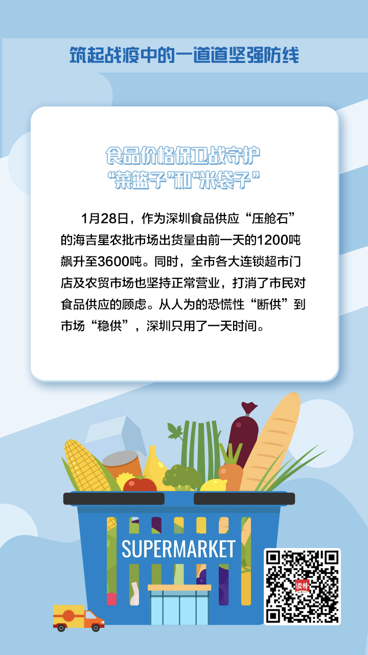 “食品價格保衛戰”第一槍在1月27日打響。當天,市菜籃子工程領導小組召集各大商超市場責任人開會,制定詳細的作戰計劃。1月28日,作為深圳食品供應“壓艙石”的海吉星農批市場出貨量由前一天的1200噸飆升至3600噸。同時,全市各大連鎖超市門店及農貿市場也堅持正常營業,打消了市民對食品供應的顧慮。從人為的恐慌性“斷供”到市場“穩供”,深圳只用了一天時間。