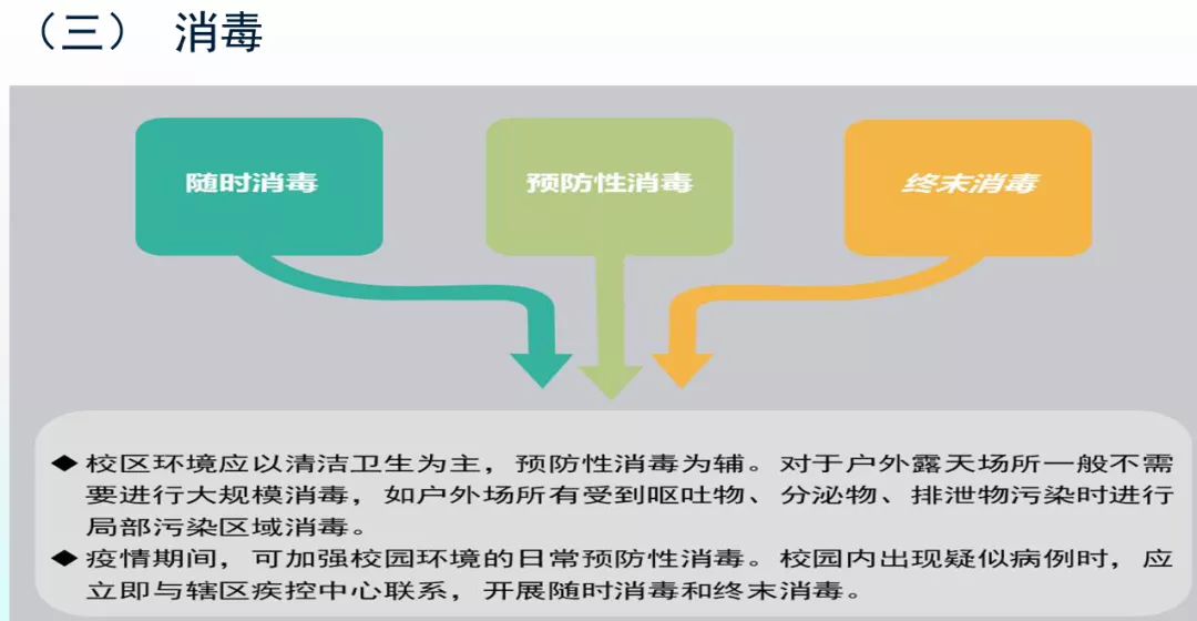 二是實施校園封閉式管理。做好校園衛生整治、“四害”消殺和重點場所的預防性消毒。設置相對獨立的健康觀察區(室)、設置洗手設施、儲備足夠的防護用品等措施。