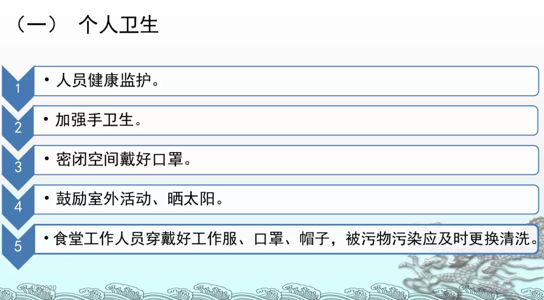 五是做好教育培訓工作。學校要開展多種形式的健康宣教,普及新冠肺炎防控知識,組織師生學習教育部和市教育局下發的各類指南和防疫知識。