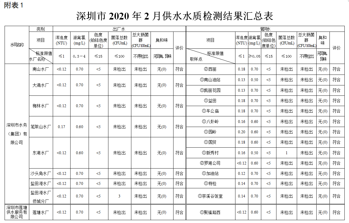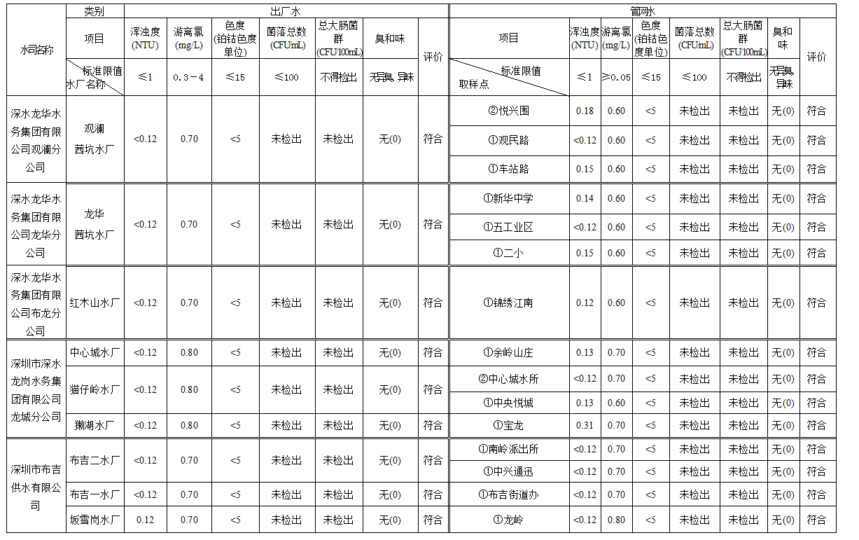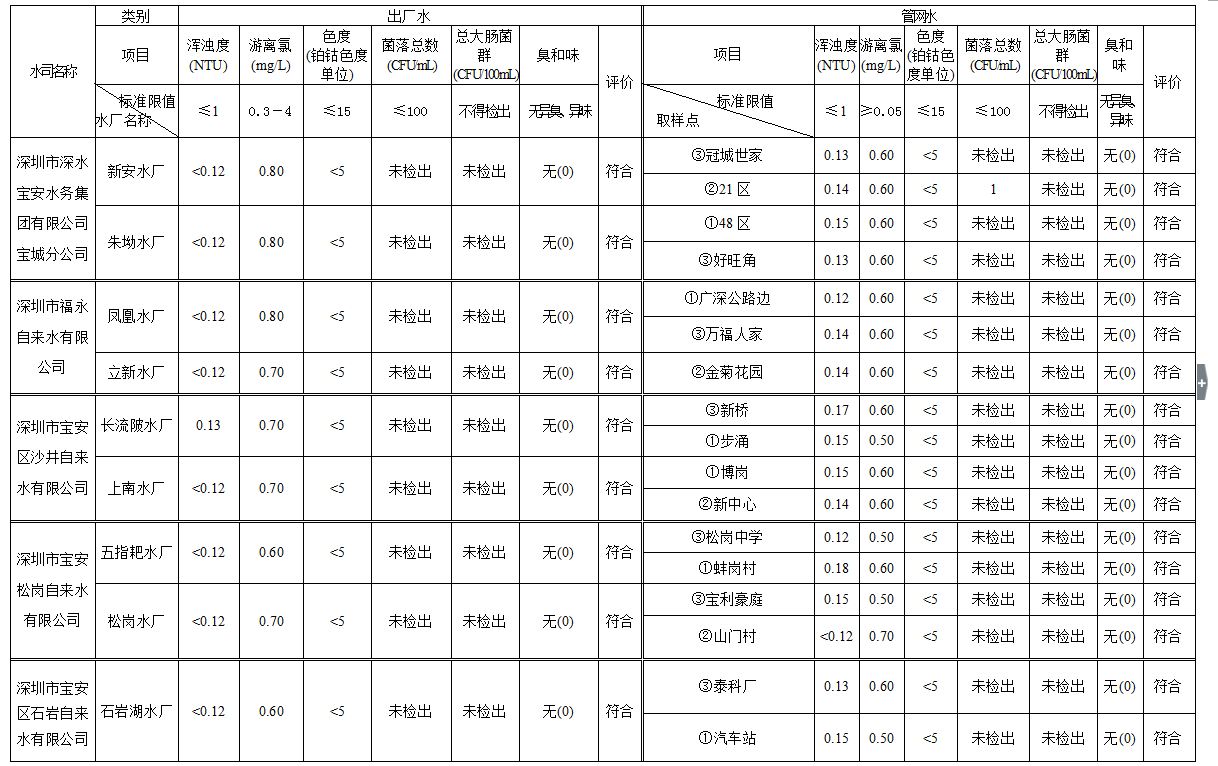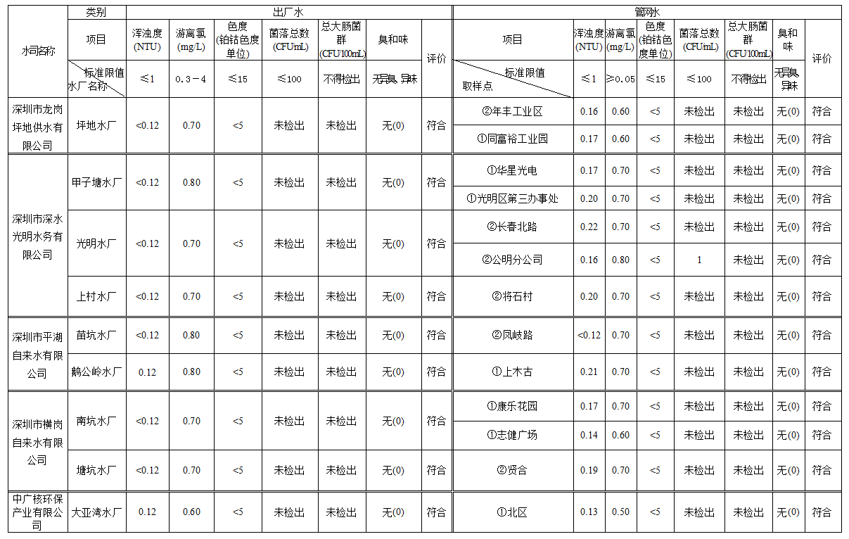 見圳客戶端·深圳新聞網2020年4月4日訊(見圳客戶端、深圳新聞網記者葉梅)2020年2月,深圳市水務局對全市42個水廠出廠水水樣以及68個管網水水樣進行了抽檢。檢測結果表明,依據GB5749—2006《生活飲用水衛生標準》,所有受檢42個出廠水水樣和68個管網水水樣的渾濁度、消毒劑(游離氯或二氧化氯或總氯)、色度、菌落總數、總大腸菌群及臭和味共6項常規指標全部符合該標準的規定,出廠水水樣合格率為100%,管網水合格率為100%。