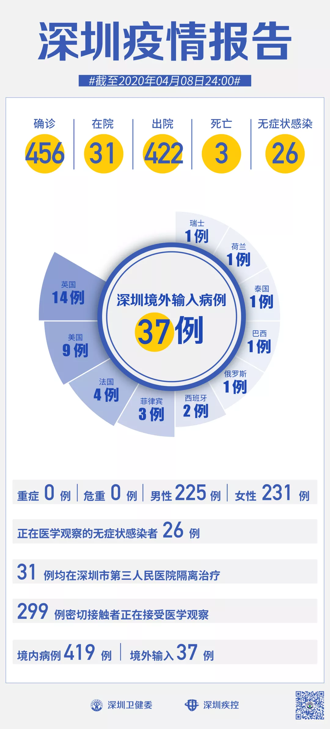 截至4月8日24時(shí),深圳累計(jì)報(bào)告新冠肺炎病例456例。4月8日當(dāng)天新增無癥狀感染者1例,出院1例。