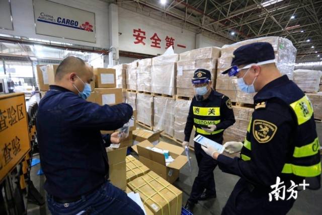 深圳海關保障深圳向國際友好城市捐贈的抗擊疫情物資順暢通關。圖為海關人員正在檢查貨場防疫物資。南方日報記者朱洪波攝
