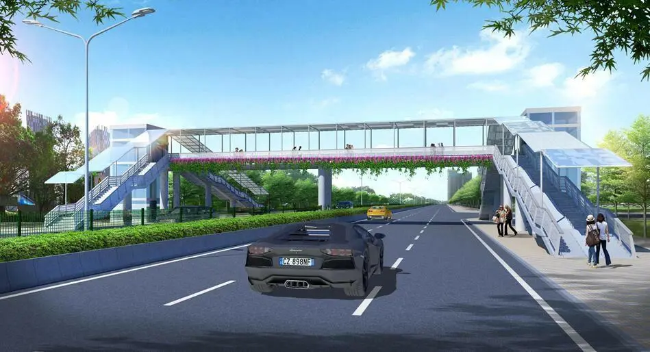 項目位于深云路南端與僑香路相接處,東側(cè)為在建的花樣年香年廣場,西側(cè)為深圳郵政快件監(jiān)管中心及懿德軒。該項目橫跨深云路,主橋為東西走向。天橋主橋采用兩跨橫跨深云路,主橋全長39.5米,主橋全寬6.3米。