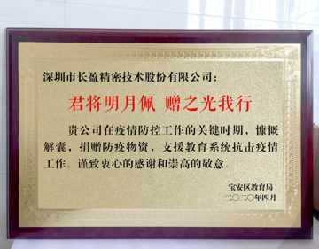 “君將明月佩,贈之光我行”,接收物資后,寶安區教育局為長盈精密公司贈送題詞牌匾,以表示對該公司在防疫關鍵時期慷慨解囊,支援教育系統抗擊疫情工作的感謝和敬意。