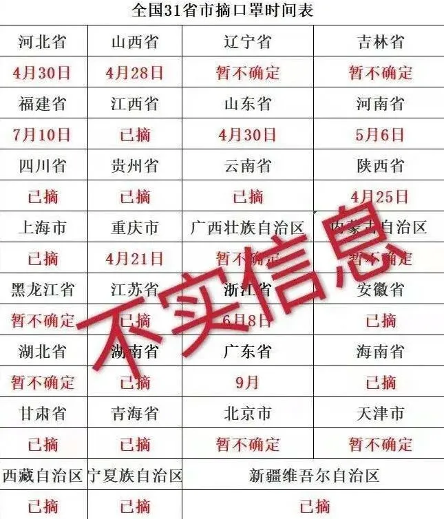 近日,一張網(wǎng)絡(luò)截圖在微信群流傳,截圖內(nèi)容中包含了全國各地摘口罩的時間。