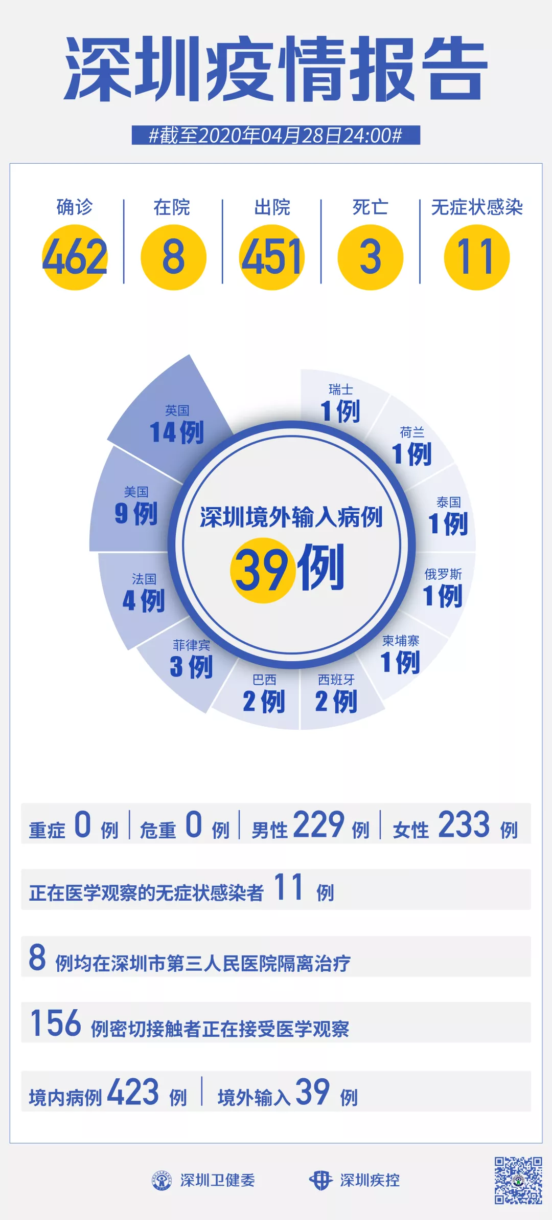 截至4月28日24時,深圳累計報告新冠肺炎病例462例。4月28日當(dāng)天新增境內(nèi)病例1例,出院4例。