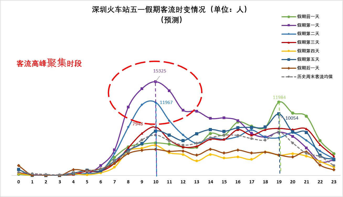 預計5月1日(假期第一天)和5月2日(假期第二天)上午為深圳寶安國際機場、深圳火車站客流高峰時段,深圳北站客流高峰時段較易集中在4月30日(假期前一天)晚間及假期期間12:00后。
