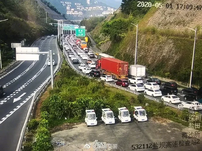 5月1日上午8時起,沈海高速荷坳段東行、深鹽二通道東行均出現車多緩行,并持續近10個小時的車多狀態,絕大多數為出深車輛。