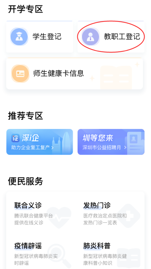 ①在首頁開學專區,點擊“教職工登記”進入申報人員列表,進行自主申報和實名認證。