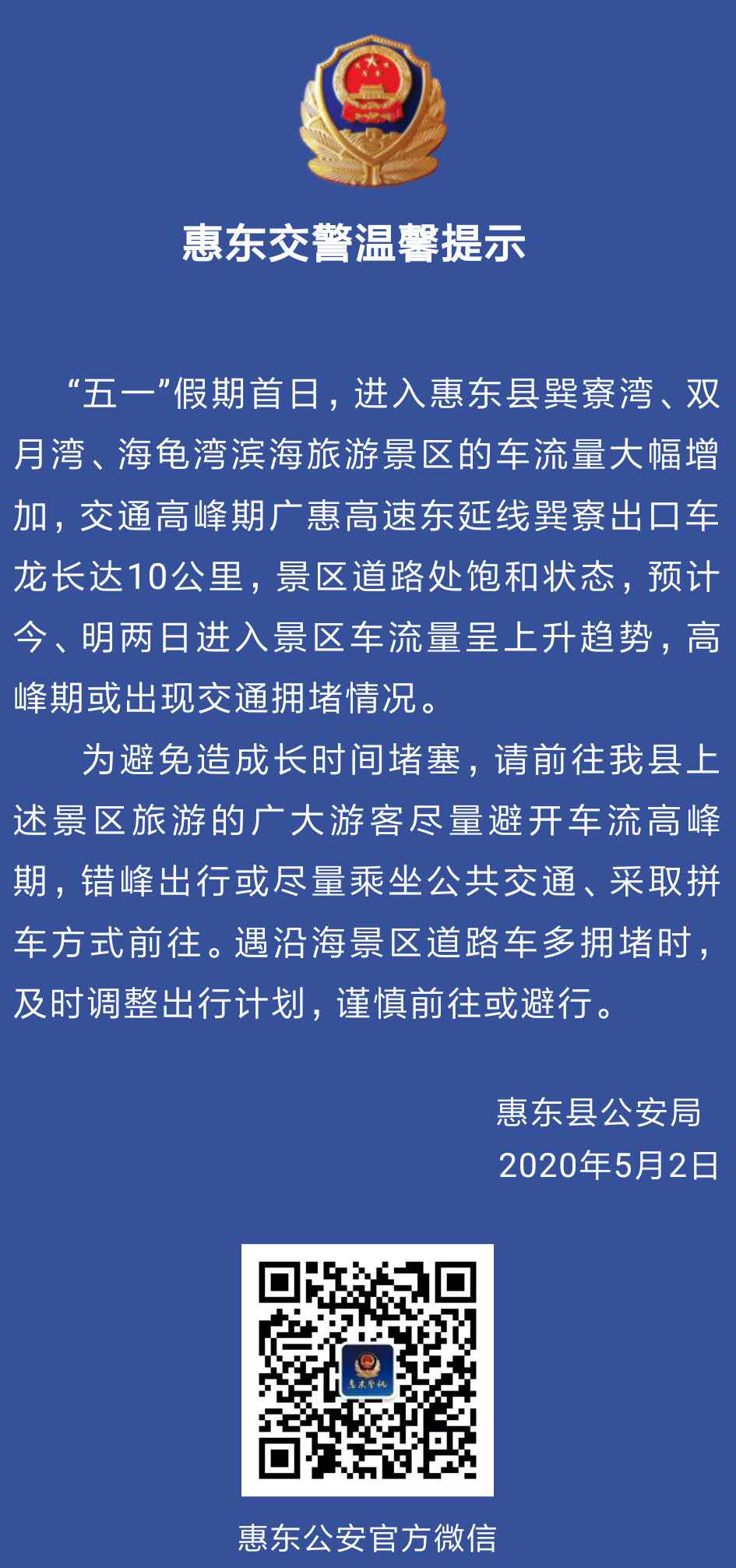 見圳客戶端·深圳新聞網2020年5月2日訊(深圳特區報記者 陳海峰 通訊員 羅漢波 文/圖)5月2日,惠州市公安局發布緊急提醒稱,“五一”假期首日,進入廣東省惠州市惠東縣巽寮灣、雙月灣、海龜灣濱海旅游景區的車流量大幅增加,交通高峰期,廣惠高速東延線巽寮出口車龍長達10公里,景區道路處飽和狀態。