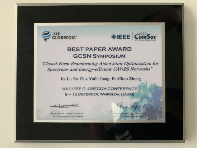 日前,由哈工大(深圳)電子與信息工程學院2017級碩士研究生李可擔任第一作者,朱旭教授、蔣宇飛助理教授、鄭福春教授為共同作者,哈工大(深圳)為第一通訊單位完成的論文《三維波束成形輔助的高譜效和能效的無人機基站網絡的聯合優化》(“Closed-Form Beamforming Aided Joint Optimization for Spectrum- and Energy-Efficient UAV-BS Networks”)入選通信領域頂級會議Globecom2019 (IEEE Global Communications Conference2019),并獲得最佳論文獎。
