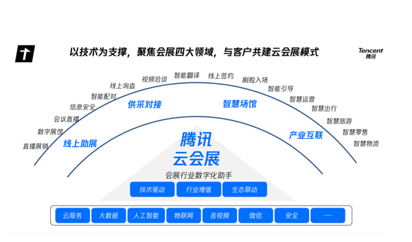 5月15日,騰訊發布全新云會展解決方案,通過線上助展、供采對接、智慧場館、產業互聯四大維度,充分輸出騰訊20多年積累的技術、連接和生態能力,為會展行業打造數字新基建,助力各行各業實現智慧化會展模式。騰訊云會展的全新發布,不僅是實體經濟向數字經濟加速轉型的標志性事件,也意味著會展行業全面進入數字化時代。