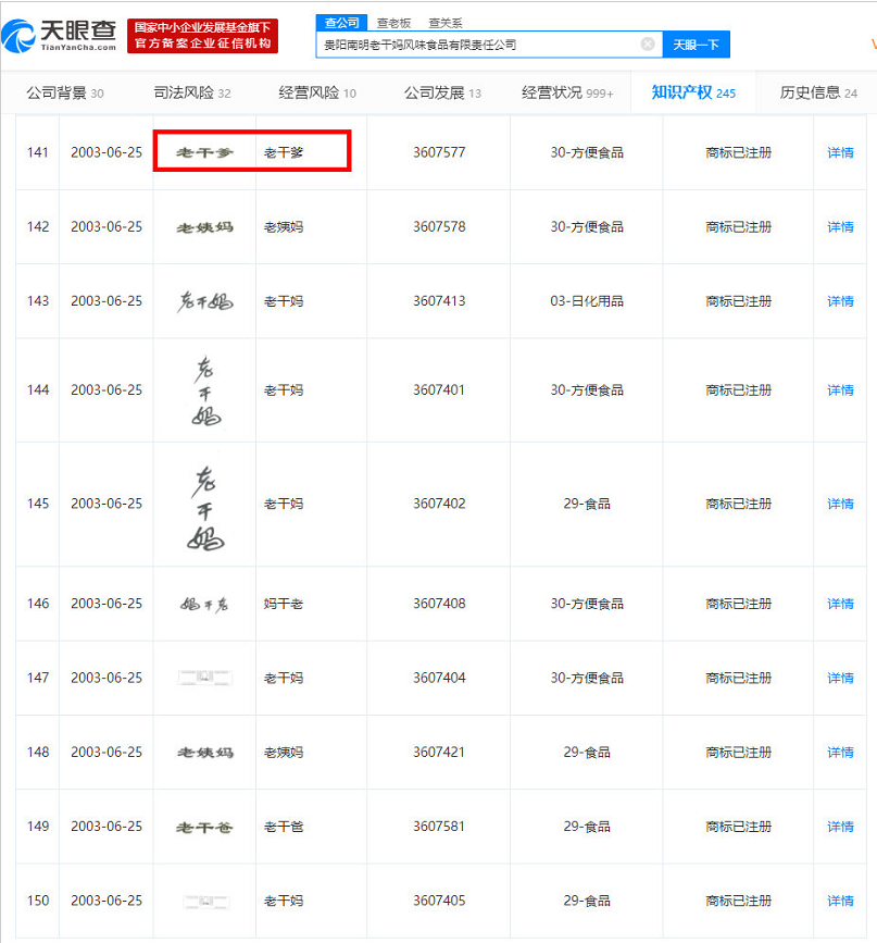 當時老干媽先走出貴州,紅遍大江南北,因受山寨困擾,便把“老干媽”“老千媽”“老干娘”、“老干爹”、“干兒子”……等商標都給注冊了,老干爹無奈退出市場。