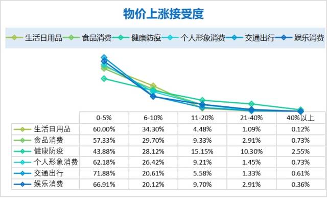 調研發現,對于生活日用品、食品消費、個人形象消費、交通出行、娛樂消費等各項消費,大部分消費者能接受的價格上漲幅度在5%以內。而健康防疫物資方面,43.88%的消費者接受5%以內的漲幅,28.12%的消費者接受6-10%的漲幅,15.15%的消費者接受11-20%的漲幅,即消費者能接受防疫物資價格較大幅度的上漲。