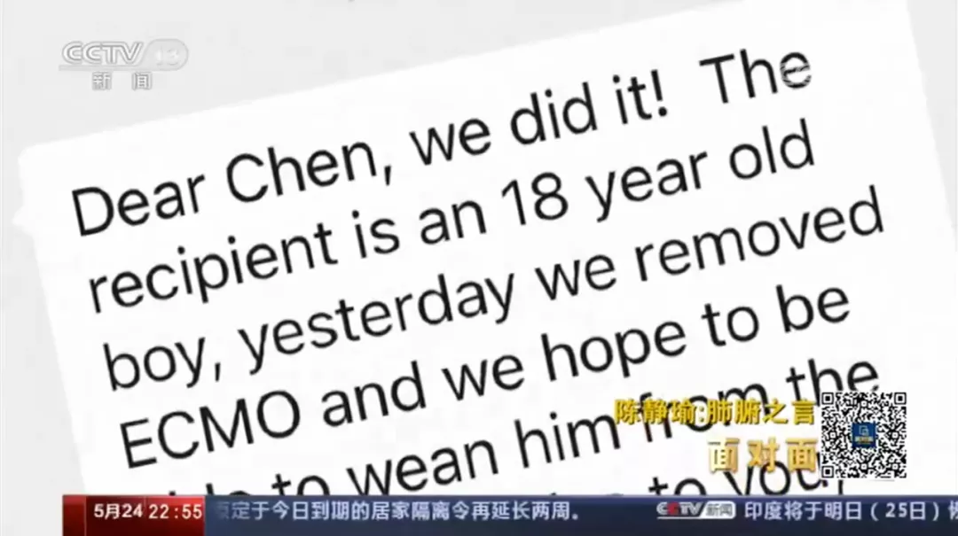 5月20日,全國人大代表、無錫市人民醫院副院長陳靜瑜收到了意大利同行發來的短信,意大利完成了歐洲首例新冠肺炎晚期肺纖維化的雙肺移植,受者是一名18歲的男孩,中國經驗在國際上得到分享傳播。