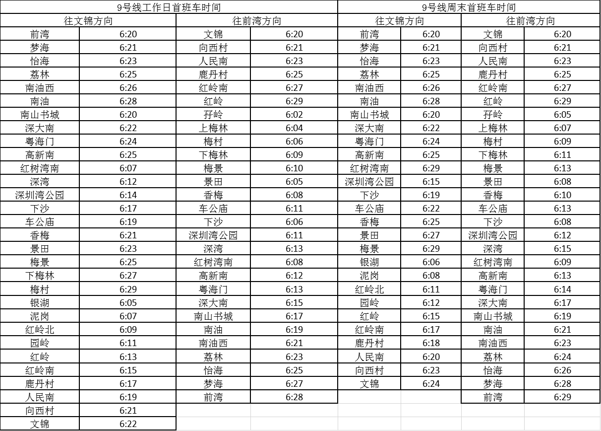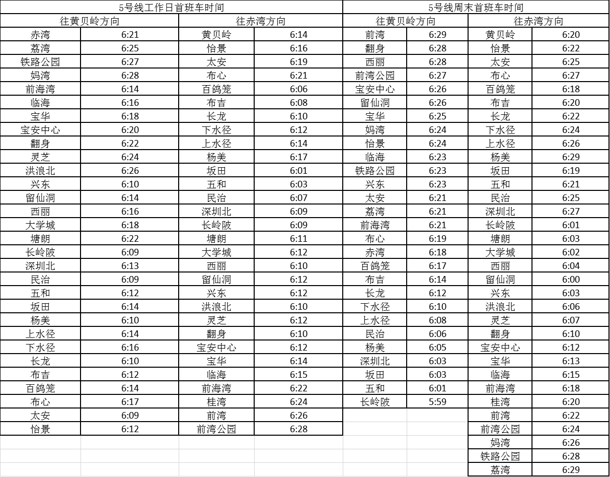記者獲悉,經優化調整后,各線路工作日首班車最早發車站點及時間分別為,1號線老街站6:29、2號線蛇口港站6:14、3號線塘坑站6:05、5號線坂田站6:01、7號線赤尾6:09、9號線銀湖6:05、11號線機場站6:04。周末期間首班車最早發車站點及時間分別為,2號線香梅北站6:07、3號線塘坑站6:04、5號線長嶺陂站6:00、7號線皇崗口岸站6:09、9號線孖嶺站6:05、11號線機場站6:03。