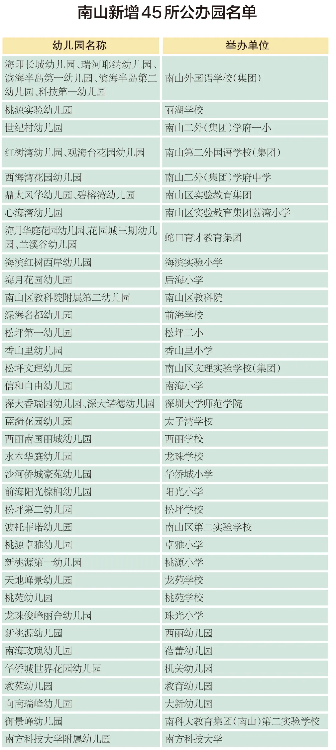 其中2所為原有公益民辦園轉型,分別是蛇口育才教育集團陽光幼兒園和南山區科技第一幼兒園。