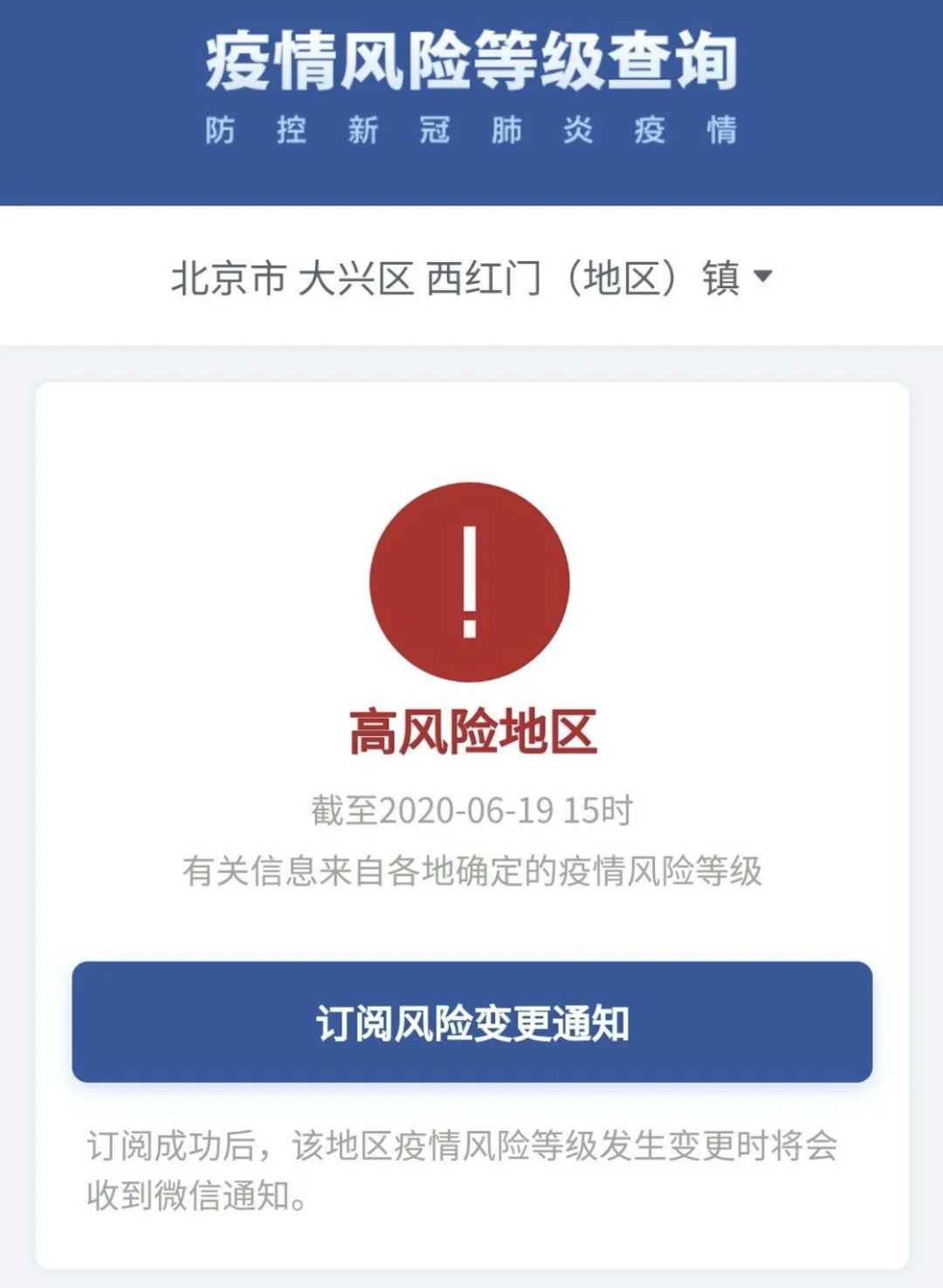 截至6月19日15時,北京大興西紅門(地區)鎮從中風險地區升級為高風險地區。