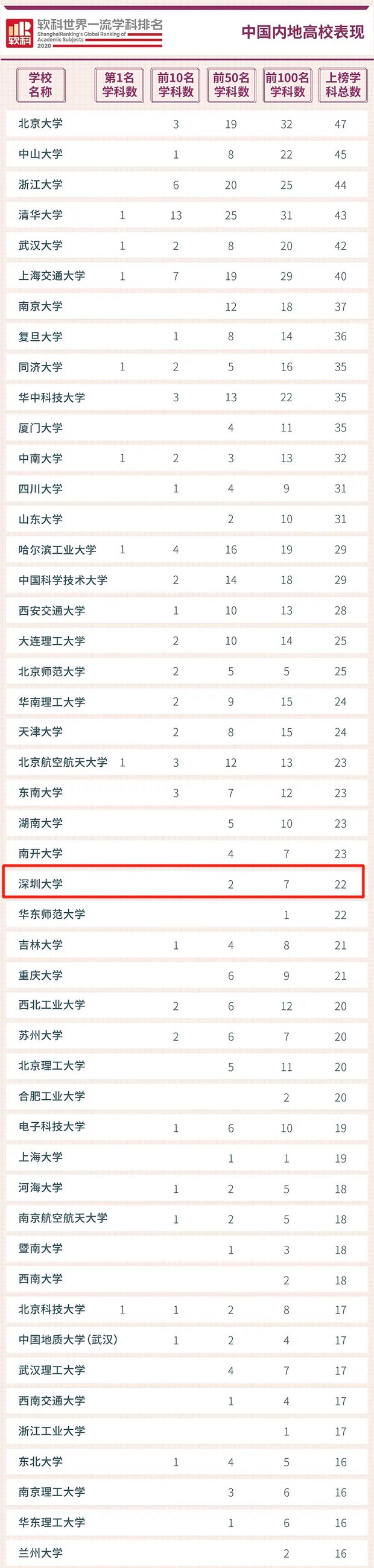 見圳客戶端·深圳新聞網2020年6月29日訊(見圳客戶端、深圳新聞網記者 梁榆其 金洪竹)6月29日,軟科正式發布2020“軟科世界一流學科排名”,排名覆蓋54個學科,涉及理學、工學、生命科學、醫學和社會科學五大領域,中國內地共有253所高校上榜。深圳大學(以下簡稱“深大”)共有22個學科上榜,上榜學科數領跑地方高校,總上榜學科數位列中國內地高校26位,其中,7個學科位列世界百強,2個學科進入世界50強。