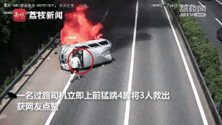 近日,重慶一面包車高速上突然失控,撞向護欄側翻,隨即起火,車內3人被困。一名司機路過,上去4腳踹碎擋風玻璃,助3人脫困。