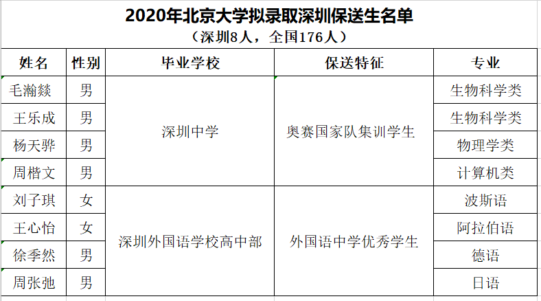 公示信息顯示,今年,清華大學擬錄取保送生191人,含深圳考生5人;北京大學擬錄取保送生176人,含深圳考生8人。
